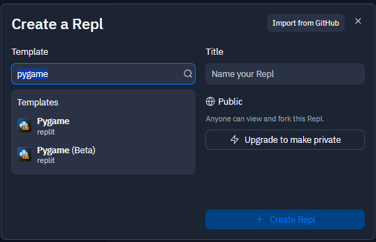 In the following popup, select the "PyGame" template and give your repl a name. It's important that you choose PyGame. Otherwise, your repl.it won't be able to handle it.
